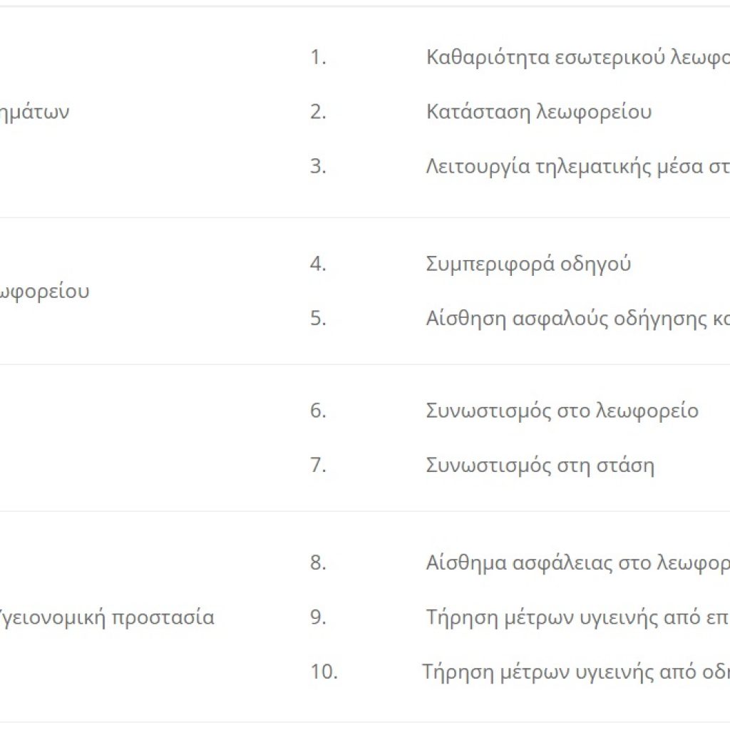 Ως άριστη κρίθηκε από τους ερευνητές η συνολική εικόνα του προσωπικού, των συνθηκών οδήγησης αλλά και της ασφάλειας μέσα στο λεωφορείο. Ο δείκτης υγειονομικής προστασίας κρίθηκε ως σχετικά χαμηλός για τους οδηγούς και σε καλύτερο επίπεδο για τους επιβάτες.